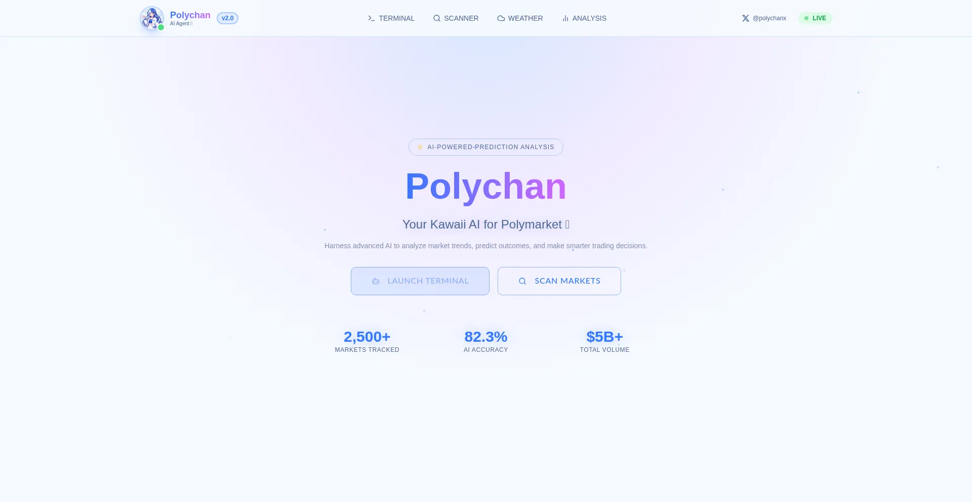 Polychan is your kawaii AI assistant for analyzing and predicting outcomes on Polymarket prediction markets. Get real-time analysis, market scanning, and AI recommendations.