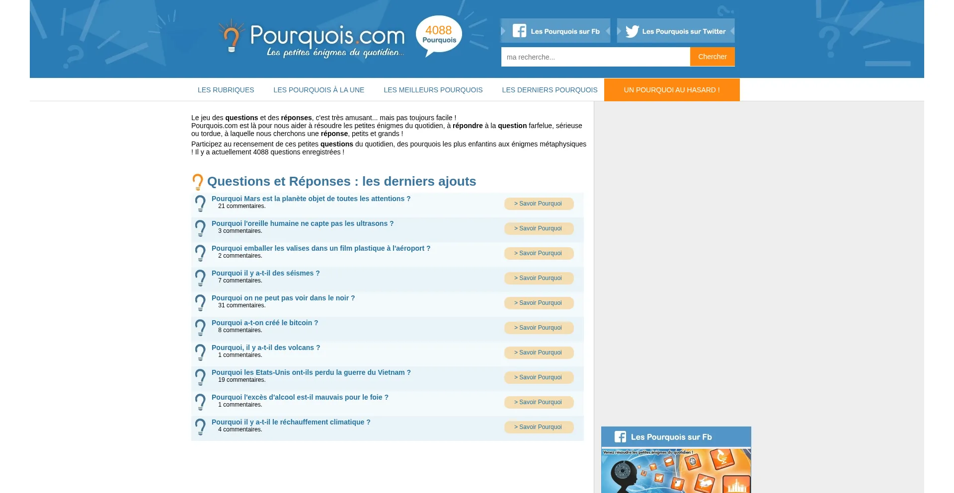 Le jeu des questions et des réponses, c'est très amusant... mais pas toujours facile ! Pourquois.com est là pour nous aider à résoudre les petites énigmes du quotidien, à...