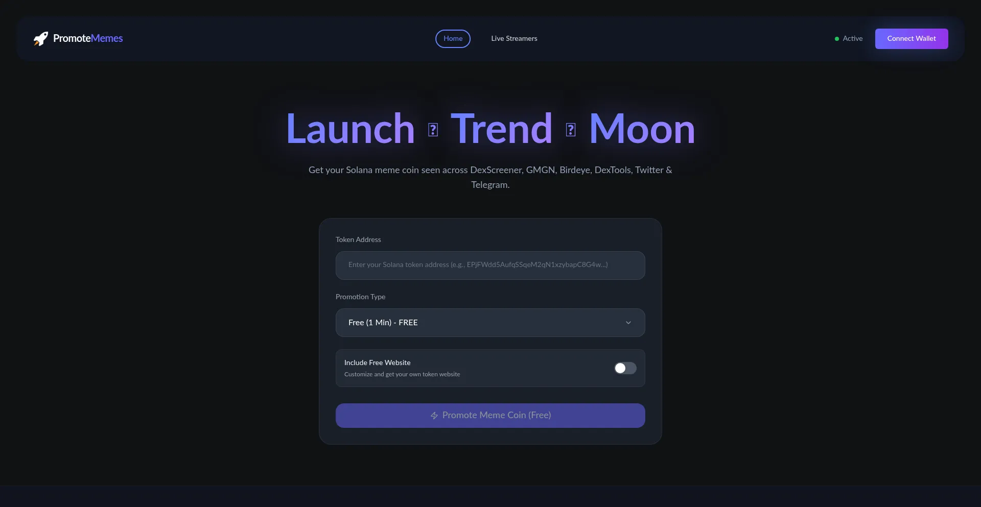 Boost your Solana meme coin with PromoteMemes - AI-powered promotion across Twitter, Telegram, DexScreener, GMGN, Birdeye & more. 1000x growth potential. Get featured on trendin...
