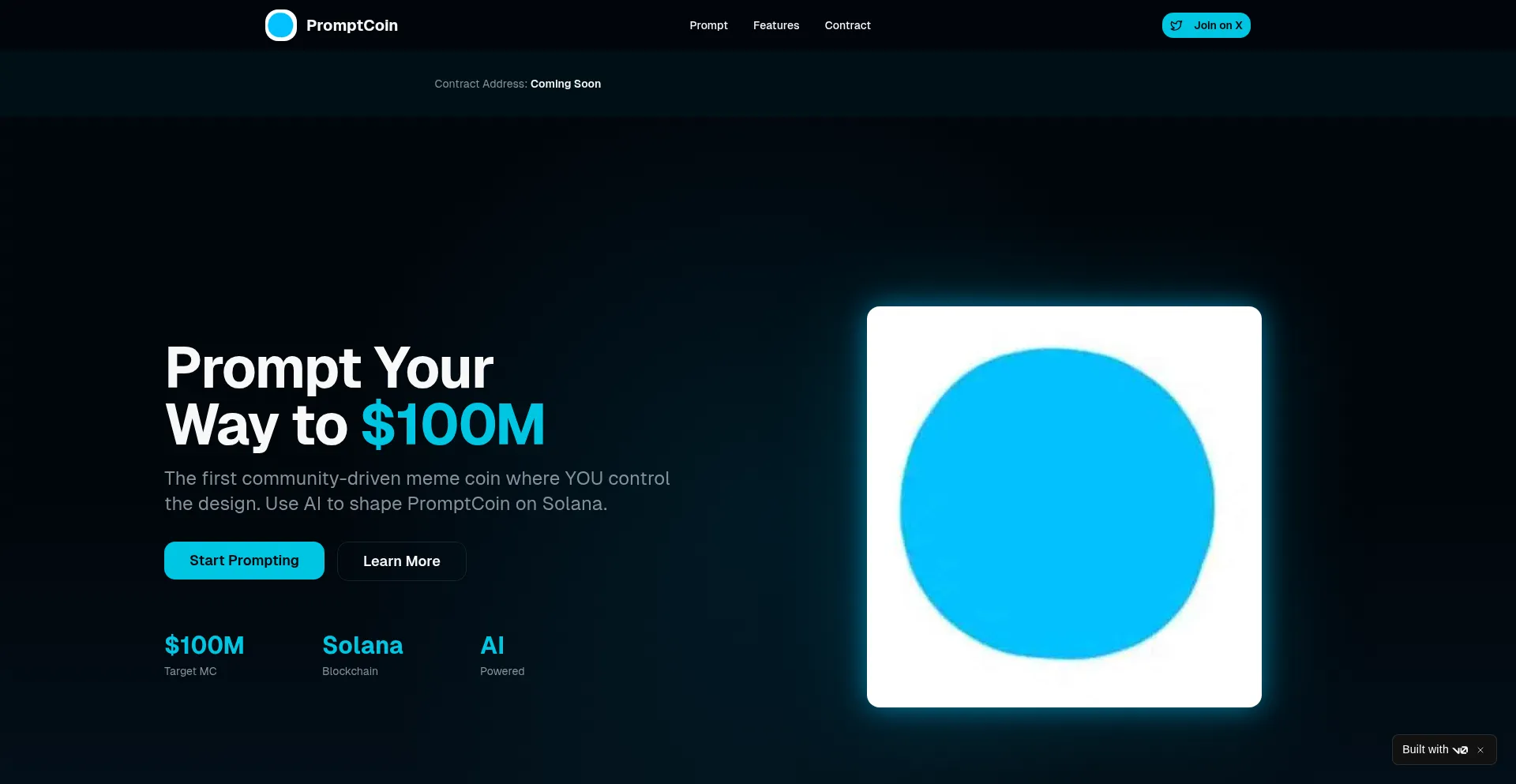 The first community-driven meme coin where YOU control the design. Use AI to shape PromptCoin on Solana. Target: $100M MC.