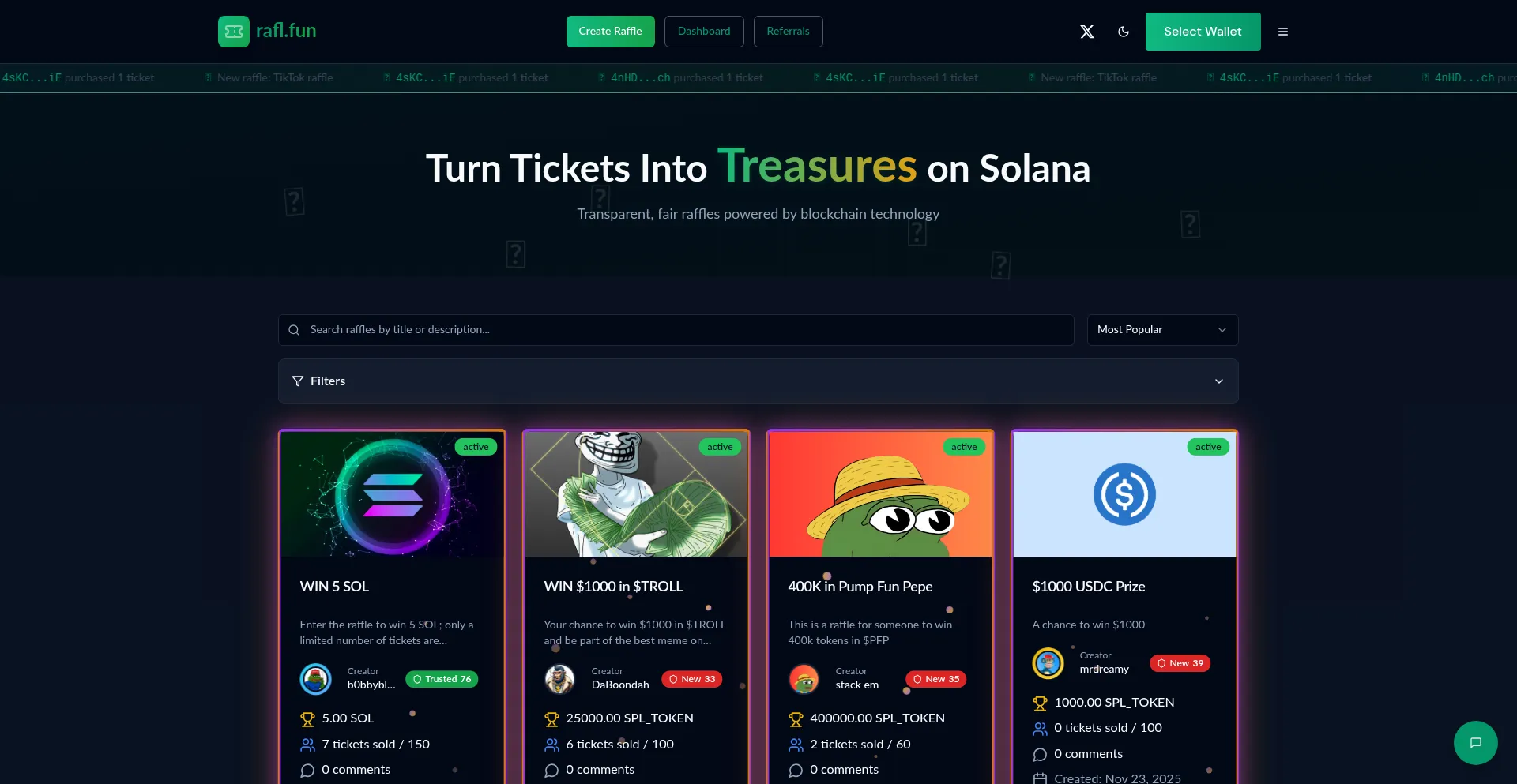 Join fair and transparent raffles on Solana blockchain. Create, Earn, Win in decentralized raffles.