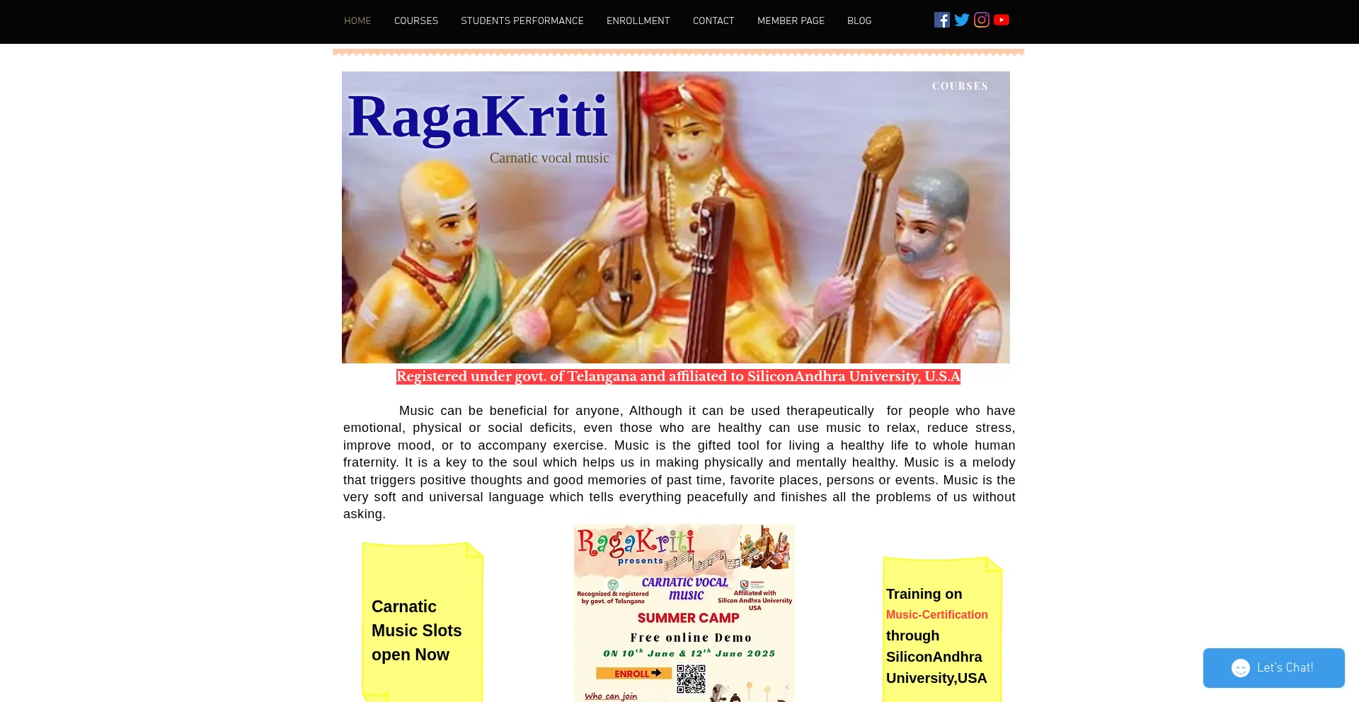 | Ragakriti | Ragakriti provides a platform for the people who are very much interested in learning Carnatic Vocal Music and various Kritis. We provide both offline and online ...
