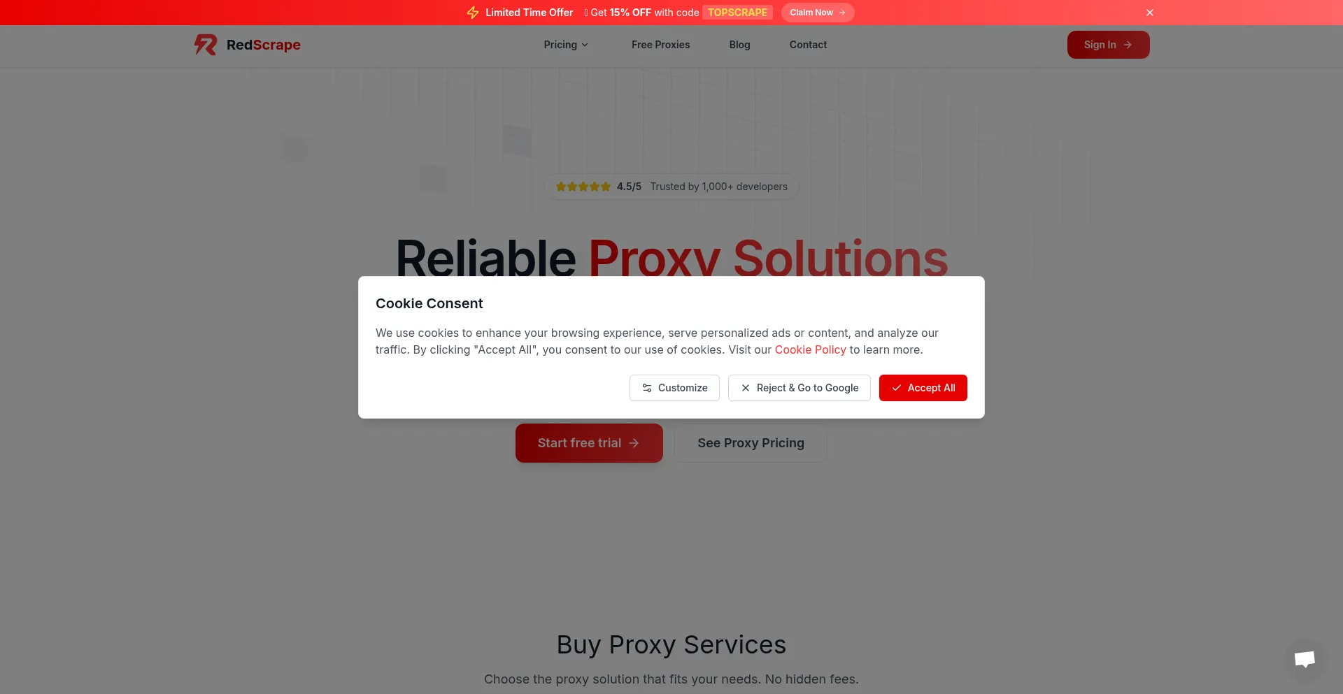O site implementa mecanismos de consentimento de cookies em conformidade com regulamentações de privacidade como GDPR ou CCPA. Isso demonstra que redscrape.com adere a padrões de proteção de dados e fornece aos usuários controle sobre práticas de coleta de dados pessoais.