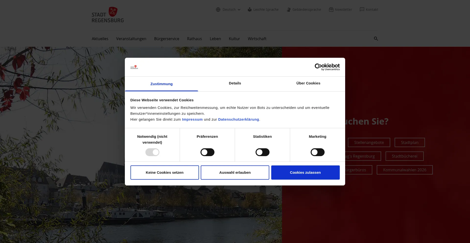 O site implementa mecanismos de consentimento de cookies em conformidade com regulamentações de privacidade como GDPR ou CCPA. Isso demonstra que regensburg.de adere a padrões de proteção de dados e fornece aos usuários controle sobre práticas de coleta de dados pessoais.