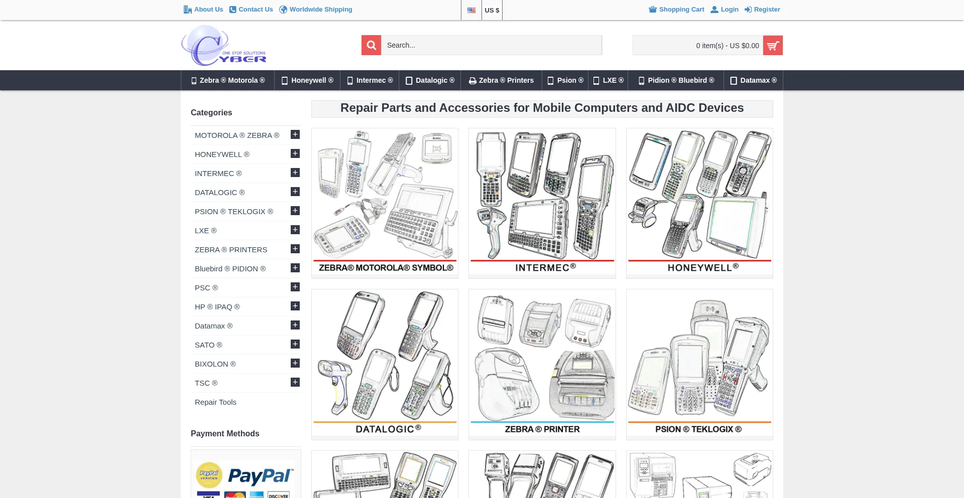 Repair parts, spare parts and accessories for mobile computers, handheld and AIDC devices are listed. There are parts for Motorola Symbol, Zebra, Intermec, Honeywell AIDC, Datal...