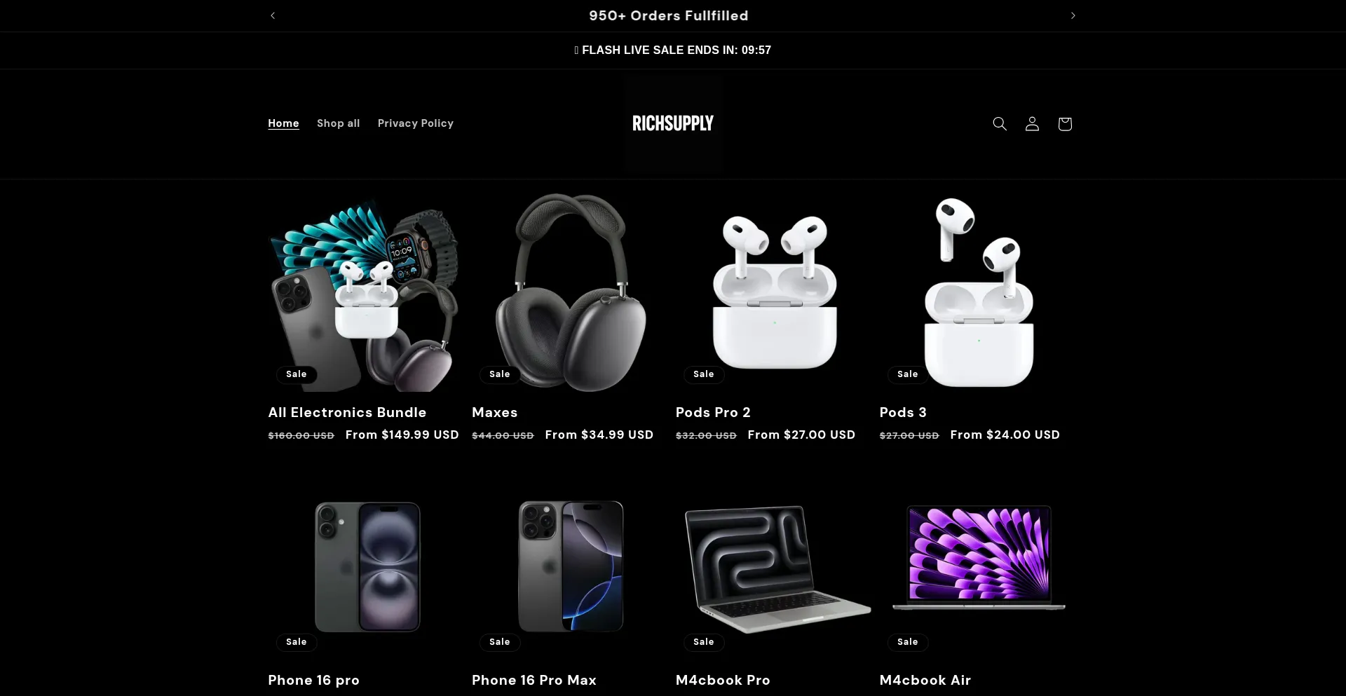 O site aproveita nomes de produtos populares e marcas para atrair tráfego e gerar interesse do usuário. Esses produtos podem ser oferecidos através de campanhas promocionais ou estratégias de desconto projetadas para aumentar o engajamento de visitantes e taxas de conversão para richsupply.co.