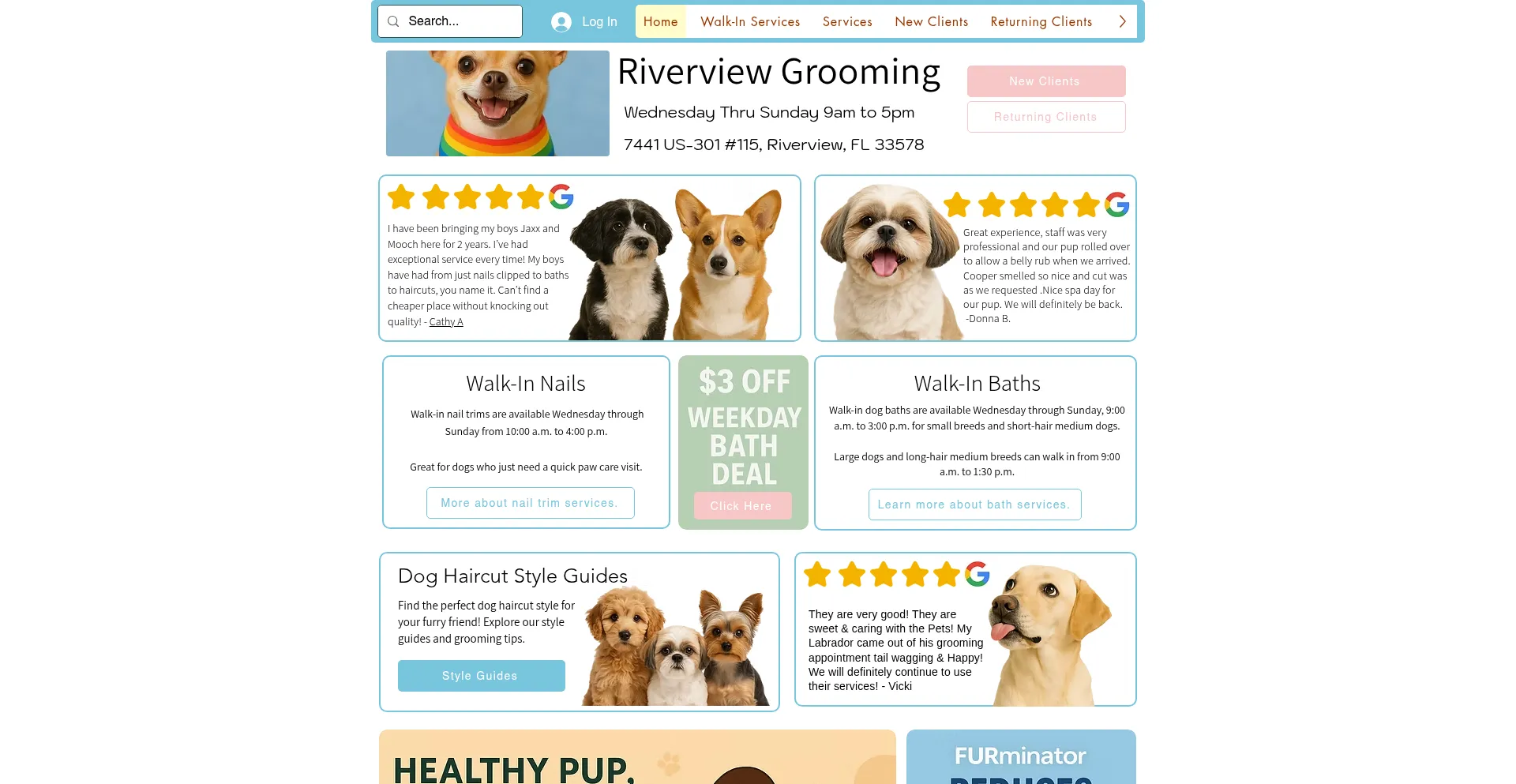New clients get $10 off! Professional dog grooming and pet grooming in Riverview, FL. Experienced pet groomers. Walk-in baths and nail trims available. Book online anytime