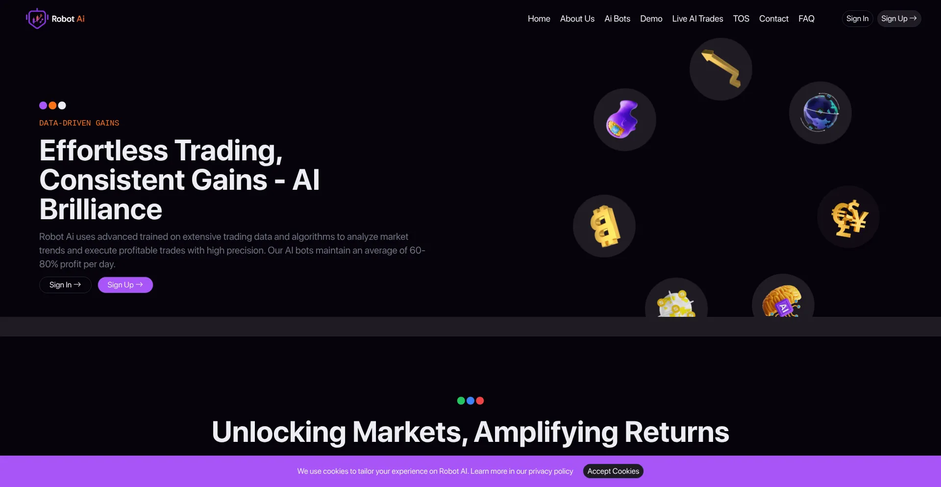 Uses advanced Robot AI trained on extensive trading data and algorithms to analyze market trends and execute profitable trades with high precision.