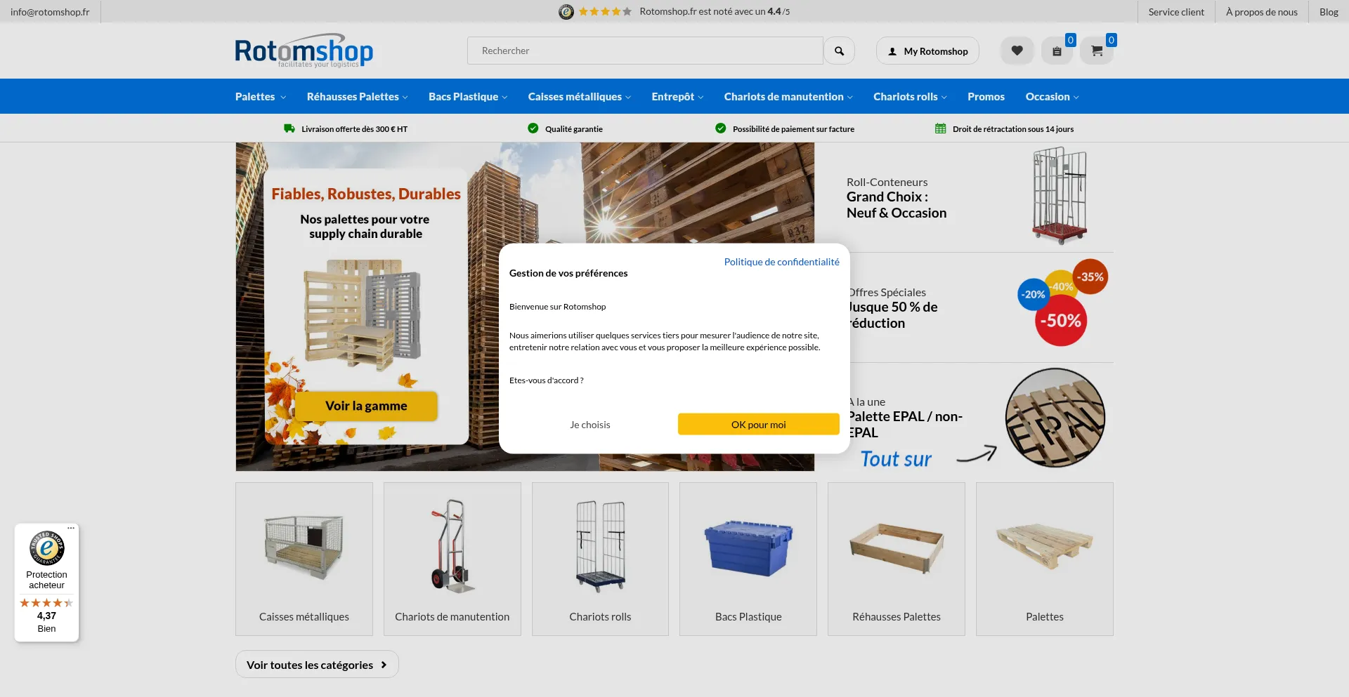 Rotomshop, spécialiste e-commerce du matériel logistique pour professionnels : palettes, racks de stockage, caisses plastique, chariots & bien plus !