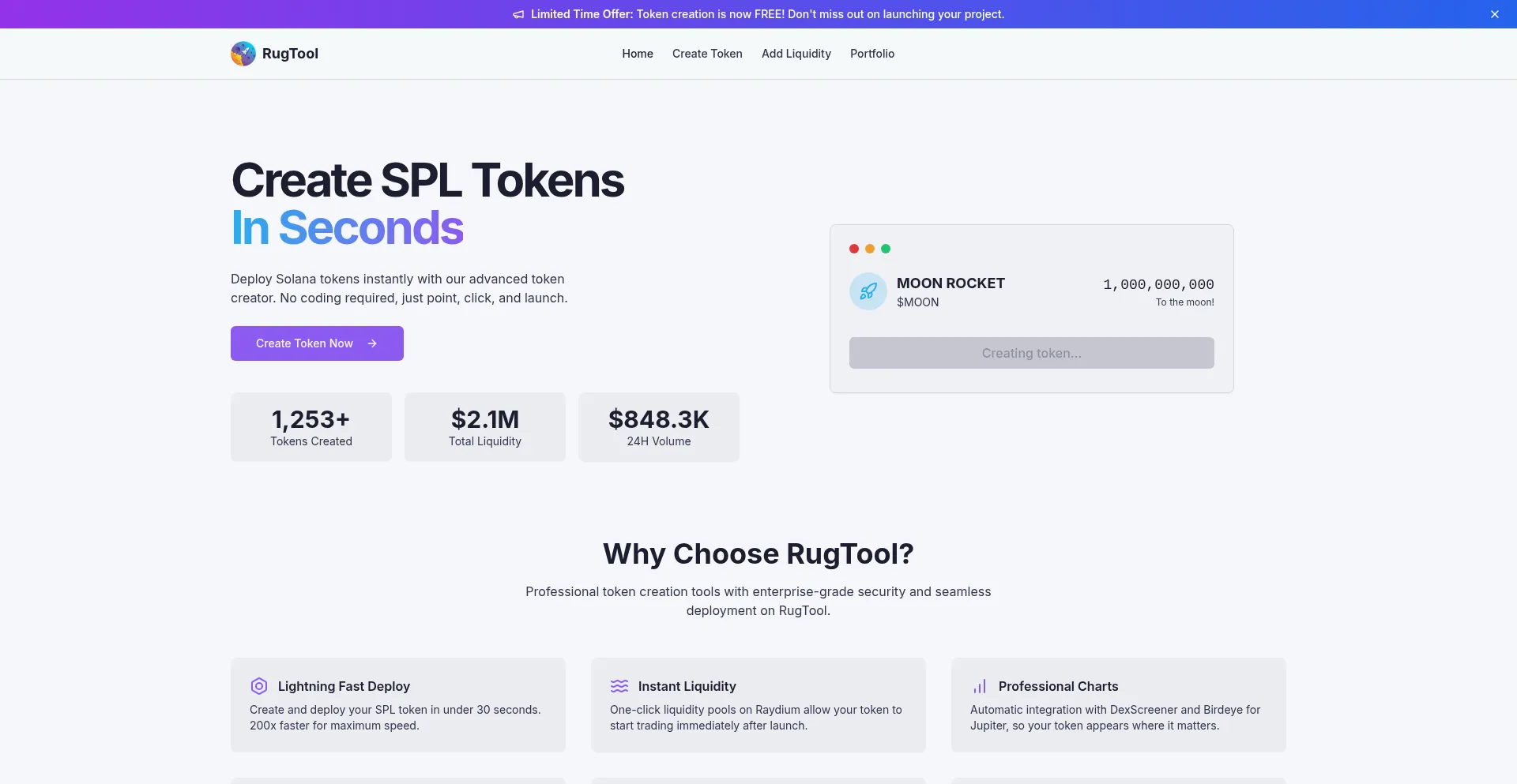 Deploy Solana SPL tokens instantly with RugTool. No coding required, just point, click, and launch your crypto project with ease. Add liquidity, manage your portfolio, and track...