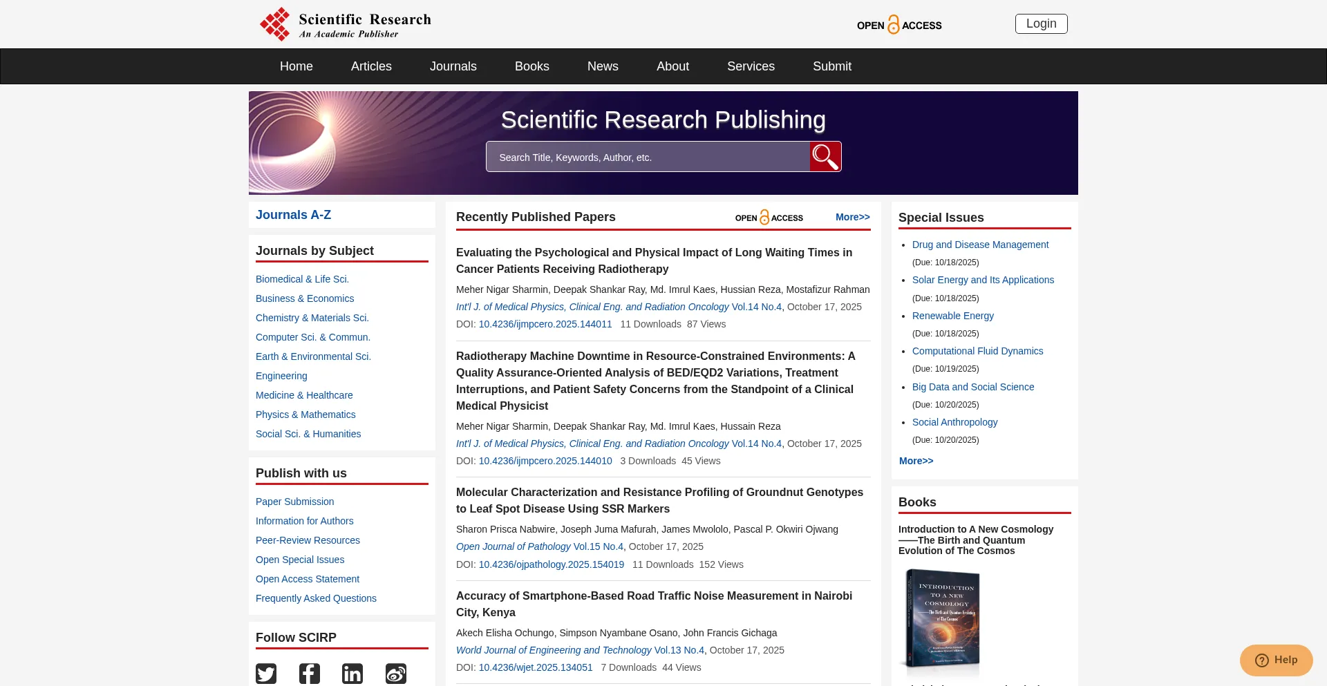Scientific Research Publishing is an academic publisher with more than 200 open access journal in the areas of science, technology and medicine. It also publishes academic books...