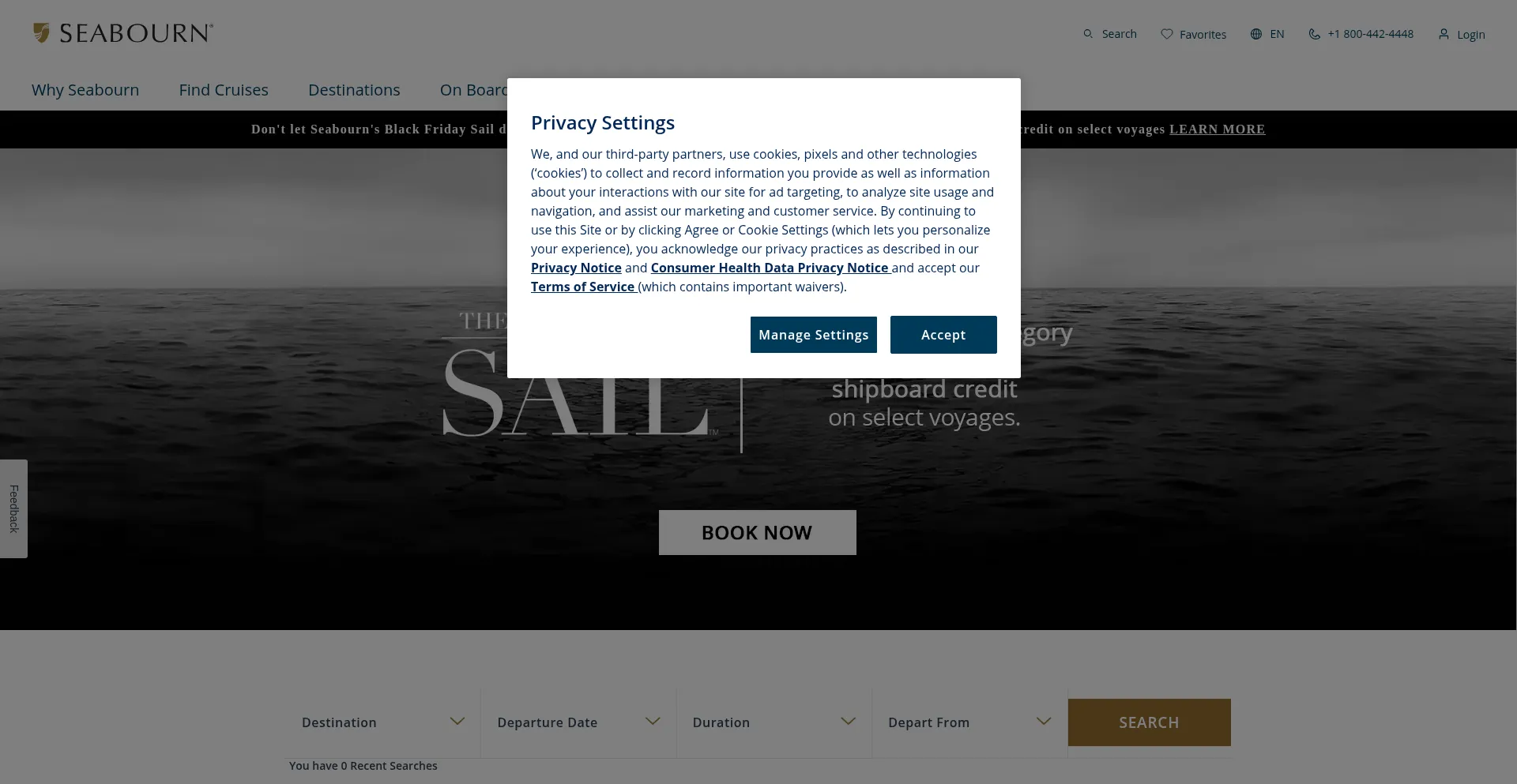 O site implementa mecanismos de consentimento de cookies em conformidade com regulamentações de privacidade como GDPR ou CCPA. Isso demonstra que seabourn.com adere a padrões de proteção de dados e fornece aos usuários controle sobre práticas de coleta de dados pessoais.
