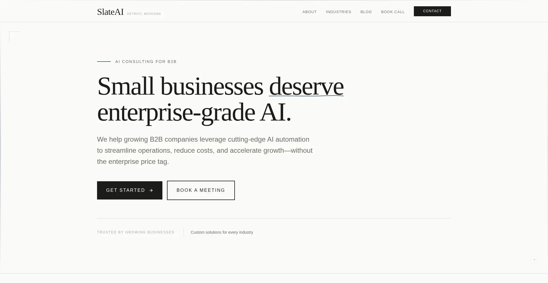 Transform your business with AI automation. SlateAI helps Metro Detroit SMBs streamline operations, reduce costs, and scale efficiently. Expert consulting from $500.
