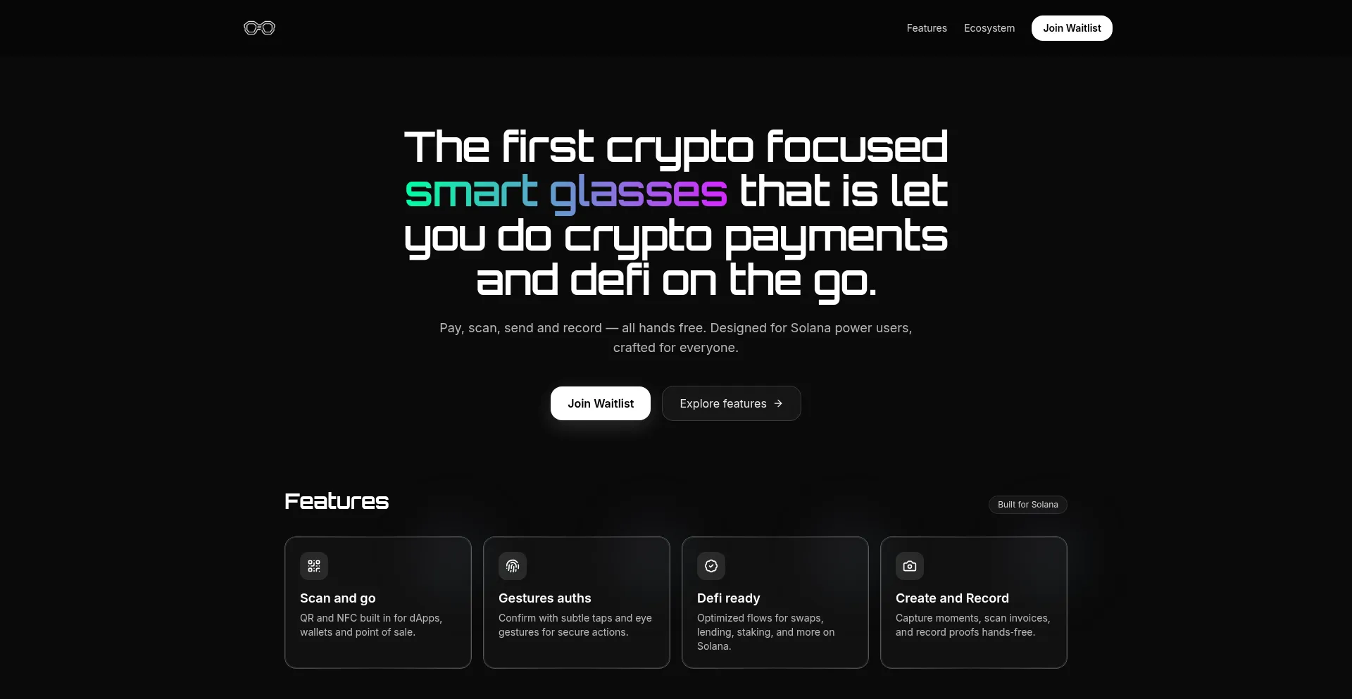 SolanaGlasses are next-gen AI-powered smart glasses built for Solana users. Scan QR codes, make on-chain payments, and interact with crypto using just your voice. Lightweight, f...