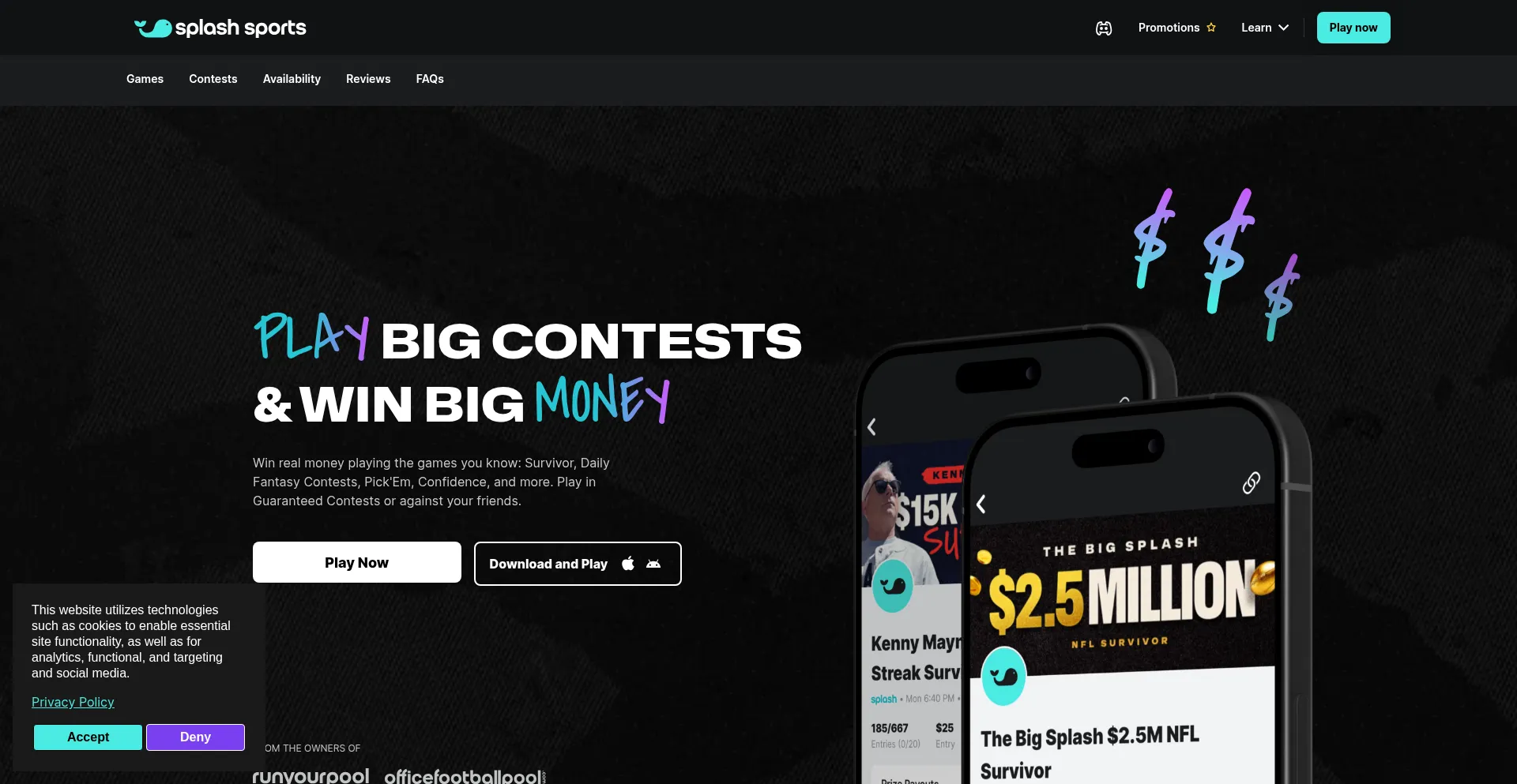 O site implementa mecanismos de consentimento de cookies em conformidade com regulamentações de privacidade como GDPR ou CCPA. Isso demonstra que splashsports.com adere a padrões de proteção de dados e fornece aos usuários controle sobre práticas de coleta de dados pessoais.