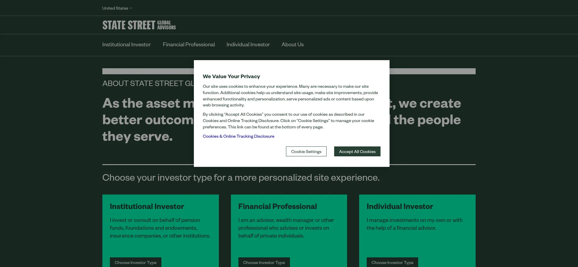 O site implementa mecanismos de consentimento de cookies em conformidade com regulamentações de privacidade como GDPR ou CCPA. Isso demonstra que ssga.com adere a padrões de proteção de dados e fornece aos usuários controle sobre práticas de coleta de dados pessoais.