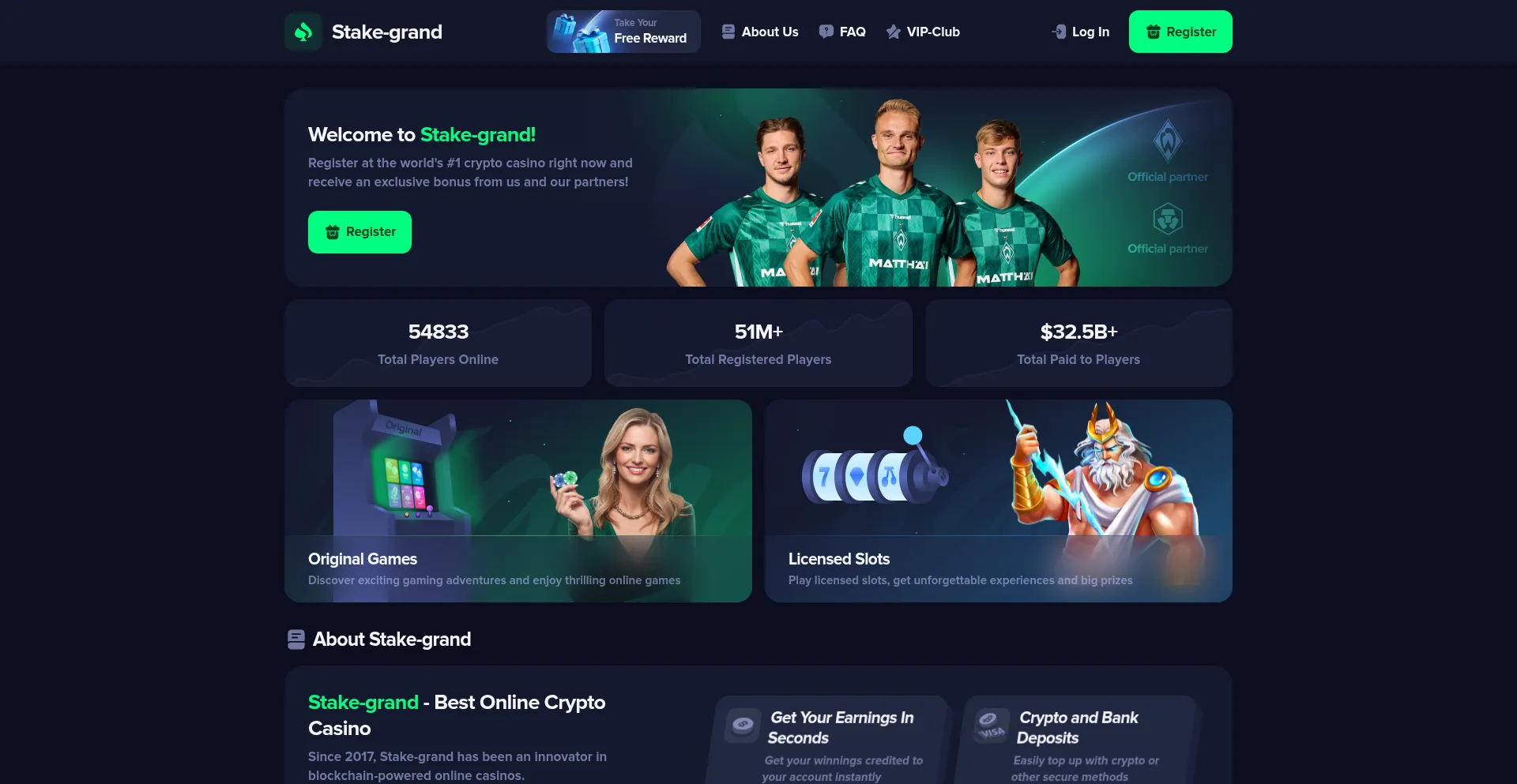 Stake-grand is a blockchain-based crypto casino with transparent smart contracts, secure bets, and has been in service since 2017.