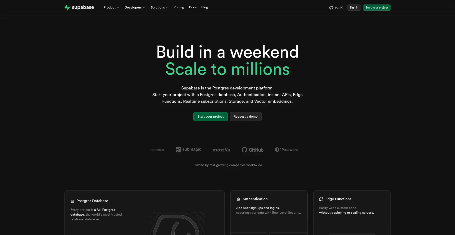 Build production-grade applications with a Postgres database, Authentication, instant APIs, Realtime, Functions, Storage and Vector embeddings. Start for free.