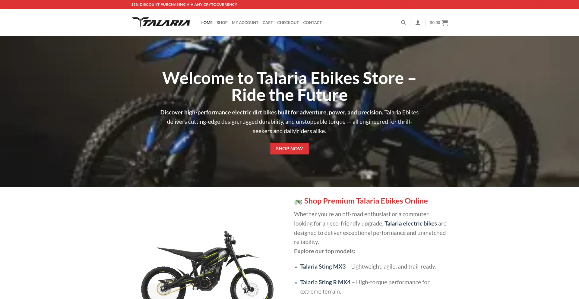 Shop Talaria electric dirt bikes built for power, speed, and adventure. Explore top models, unbeatable prices, and expert service at Talaria Ebikes Store. Ride electric today! D...