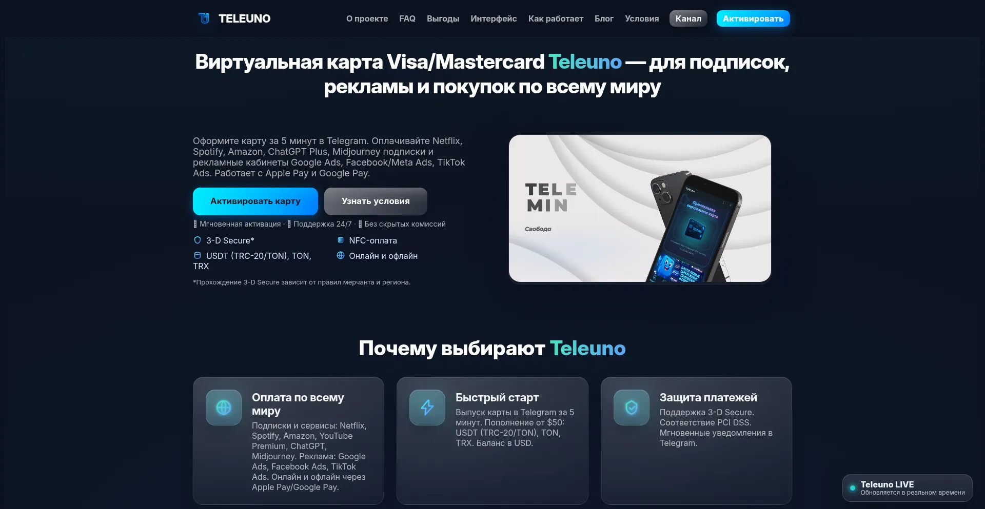 Виртуальная карта Teleuno — международные платежи, реклама, Google Pay и Apple Pay