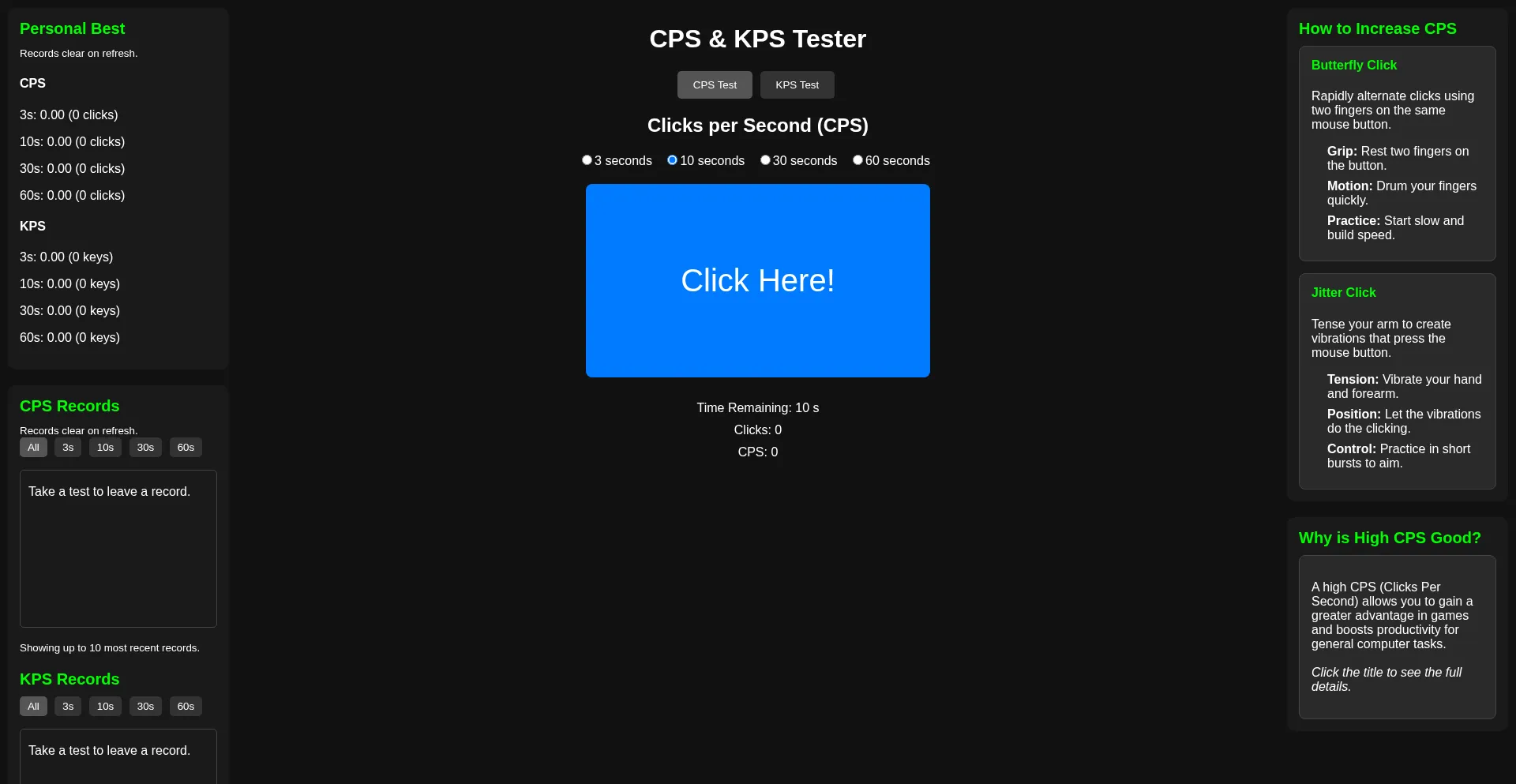 Measure your CPS (Clicks Per Second) and KPS (Keys Per Second), and register on the leaderboard to compete with people from all over the world.