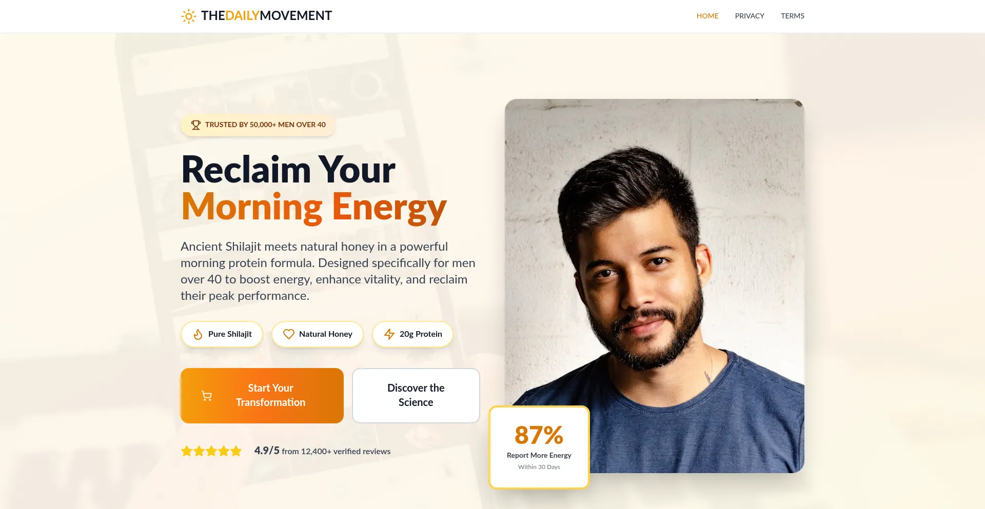 Reclaim your energy and vitality. Premium morning protein vitamin with ancient Shilajit and natural honey, specially formulated for men over 40. 60-day guarantee, free shipping.