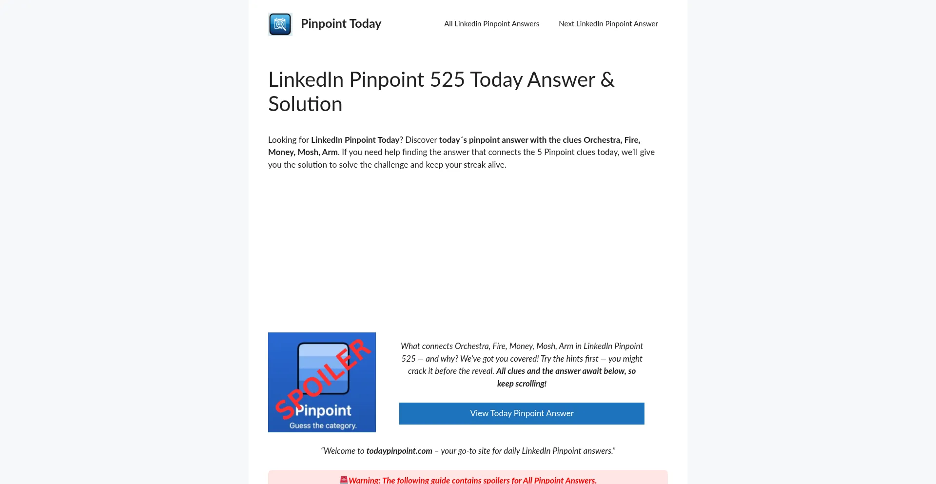 Looking for LinkedIn Pinpoint Today? Discover today´s pinpoint answer with the clues Orchestra, Fire, Money, Mosh, Arm. If you need help finding the answer