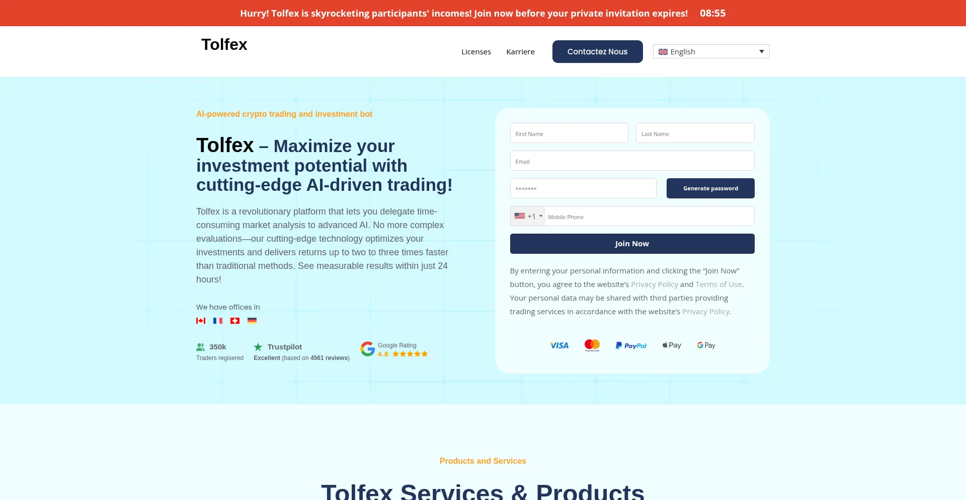 Cryptocurrency Financial Service Registration Form Artificial Intelligence Forex Trustpilot Rating Wordpress Platform Google Tag Manager Cloudflare Browser Insights Extended Data Multilanguage Young Domain