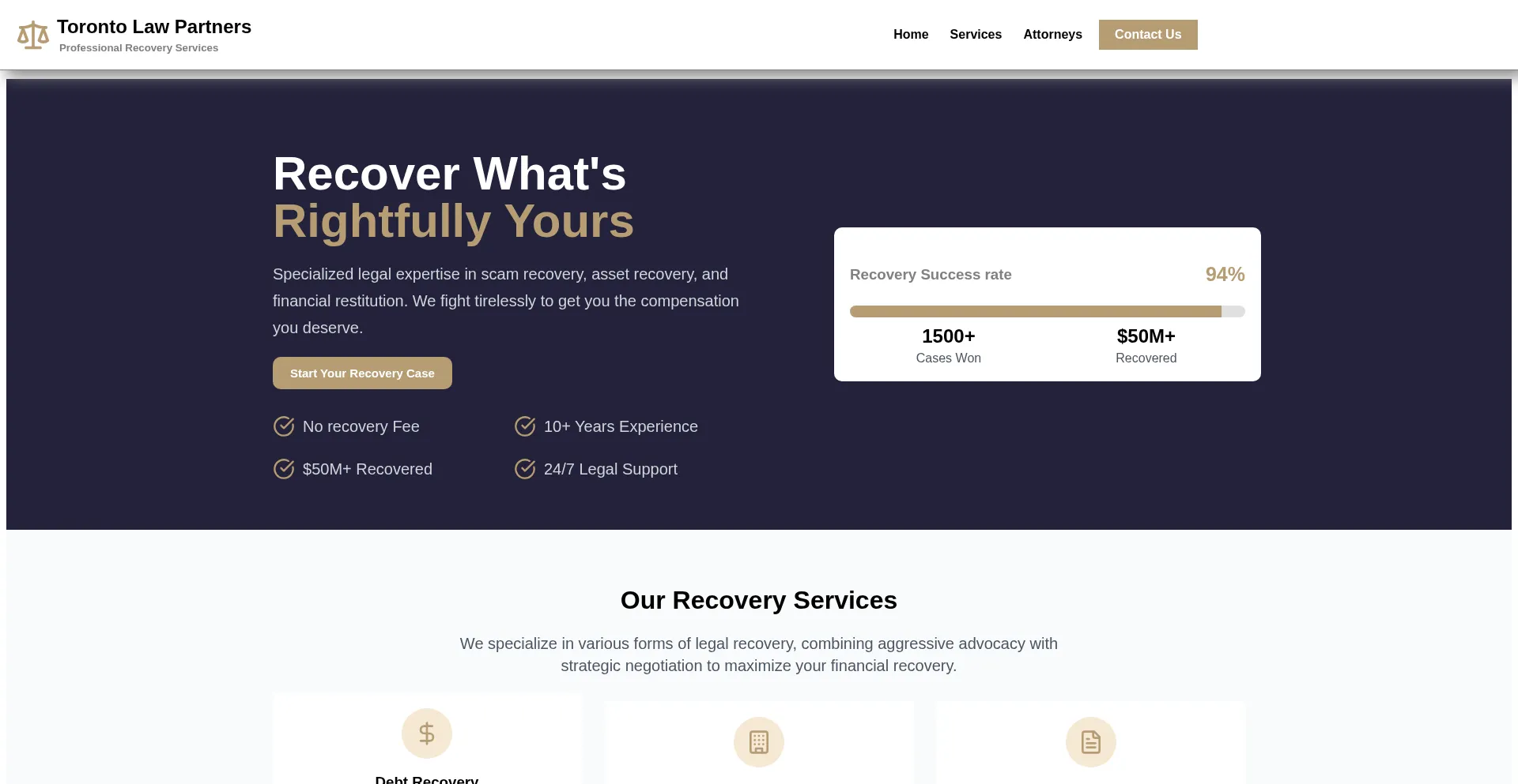 O site torontolawpartners.ca anuncia serviços de recuperação de fundos para ativos perdidos ou roubados. Enquanto alguns operam em estruturas de honorários de contingência, outros podem exigir pagamentos antecipados, o que pode indicar operações fraudulentas. Verifique credenciais e conformidade regulatória antes de contratar tais serviços.