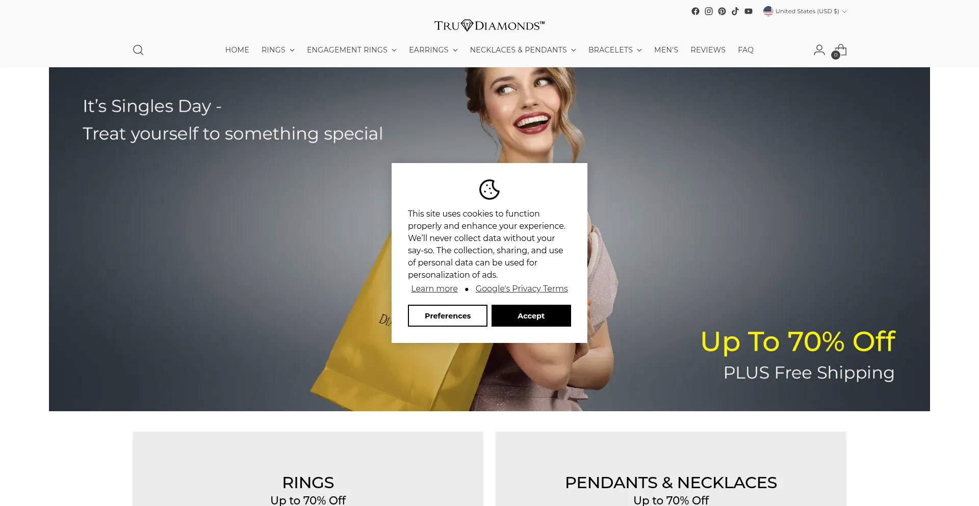 O site implementa mecanismos de consentimento de cookies em conformidade com regulamentações de privacidade como GDPR ou CCPA. Isso demonstra que trudiamonds.com adere a padrões de proteção de dados e fornece aos usuários controle sobre práticas de coleta de dados pessoais.