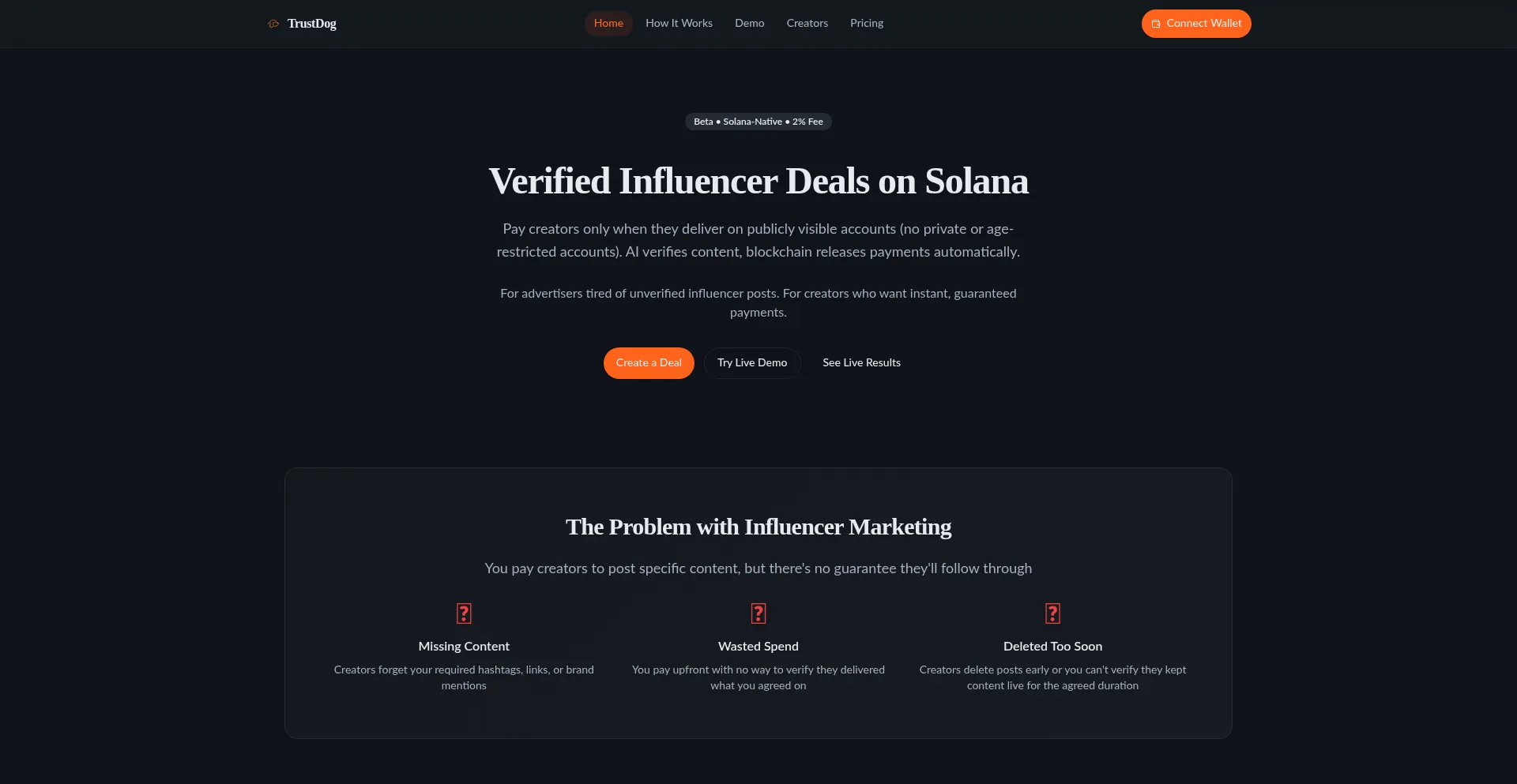 TrustDog guards your influencer social ad spend with screenshots, on-chain escrow, and automatic payout.