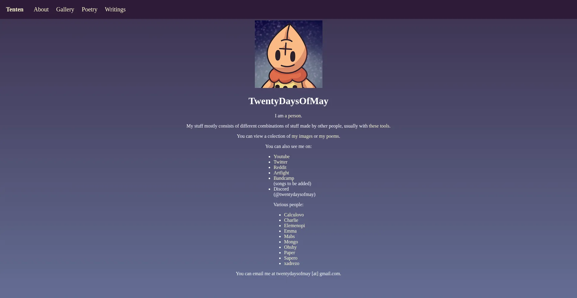 twentydaysofmay.neocities.org artfight.net twentydaysofmay.bandcamp.com calculovo.neocities.org couchville-usa.crd.co ultlang.github.io twitter.com xadrezo.neocities.org www.youtube.com atypical-artisan.tumblr.com +6 mais