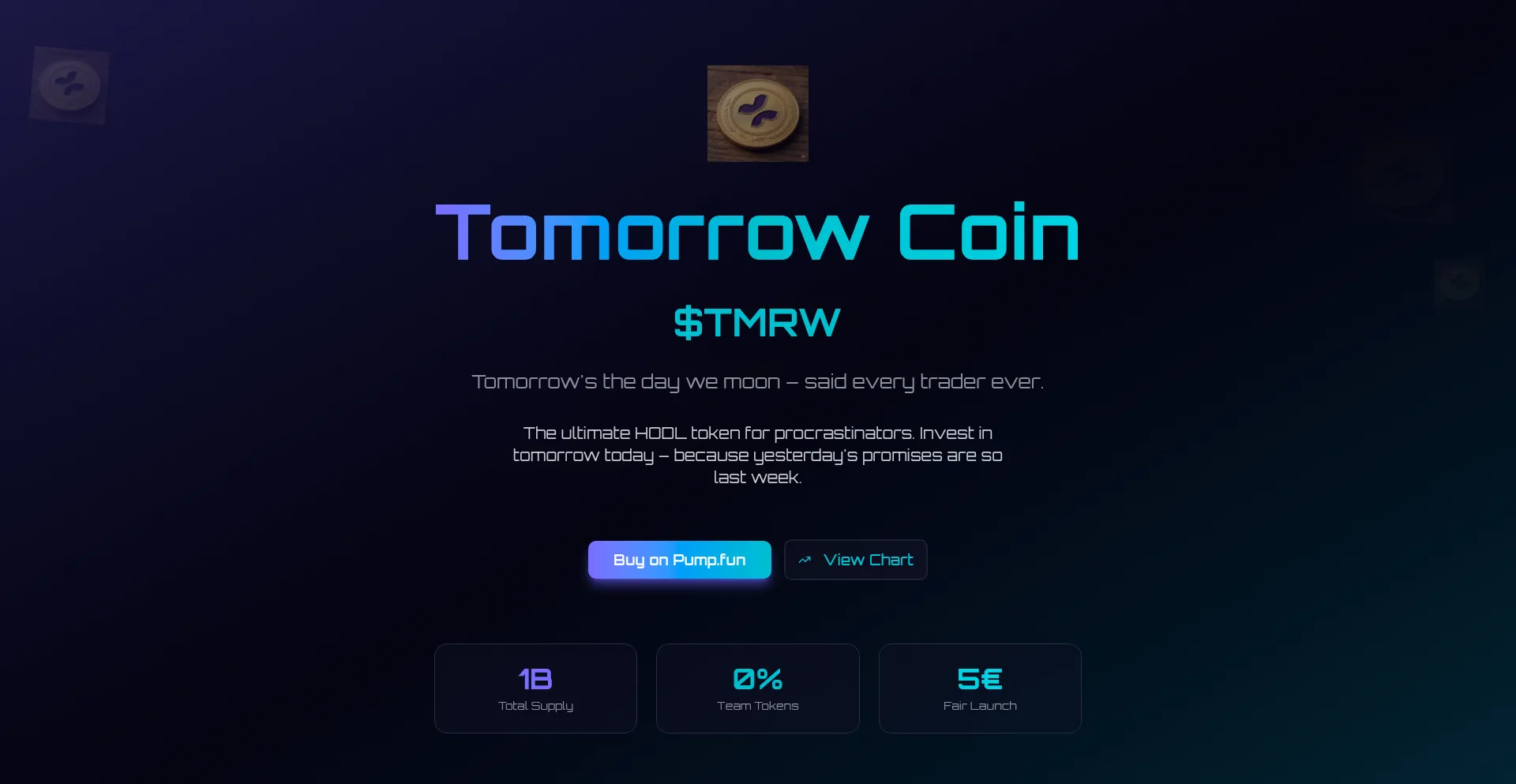 Invest in tomorrow today. Tomorrow Coin is the ultimate HODL token for procrastinators. Fair launch on Solana. No utility, just vibes.