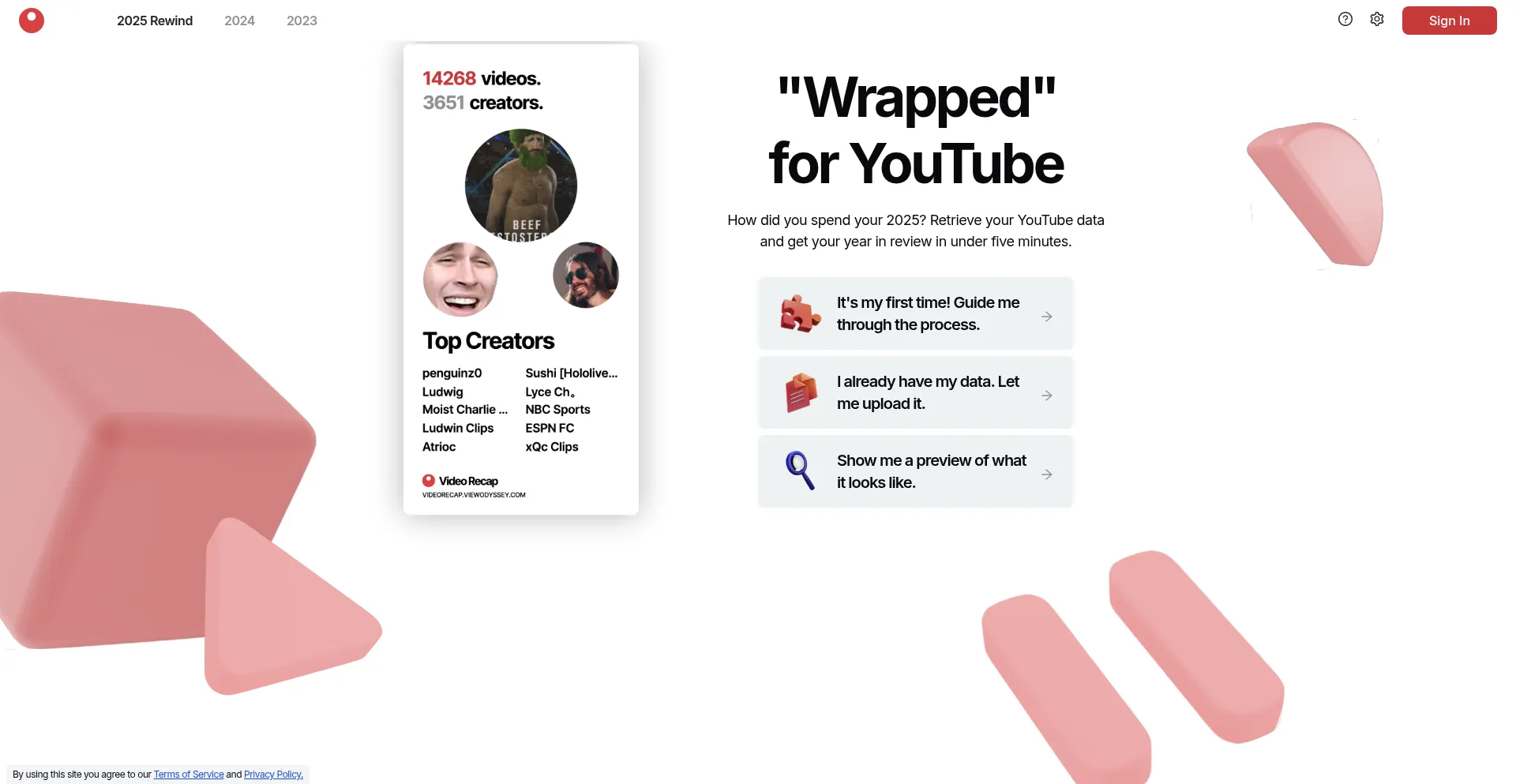 View your YouTube Wrapped by visualizing your YouTube data. See your viewing habits and discover your top creators of the year.