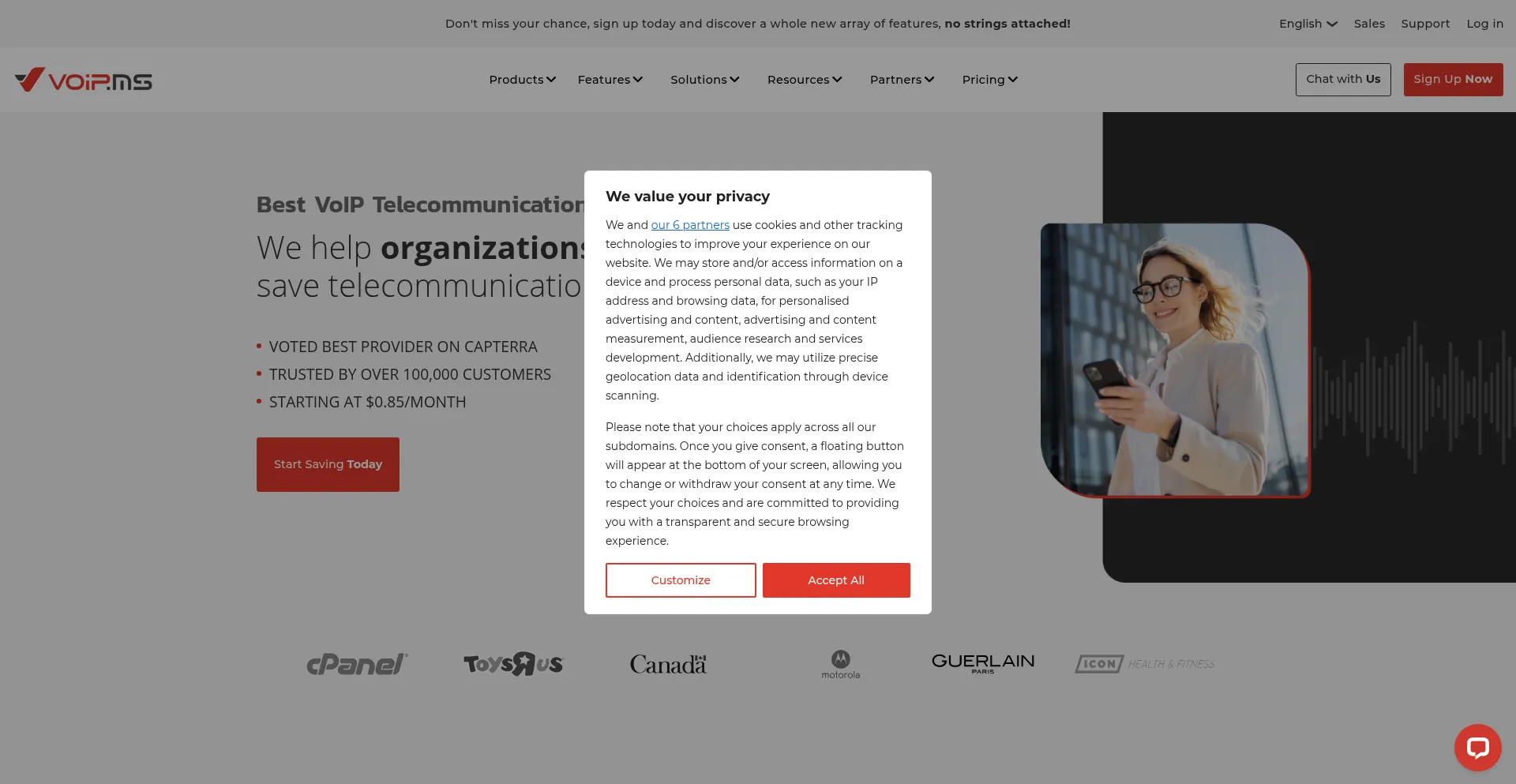 O site implementa mecanismos de consentimento de cookies em conformidade com regulamentações de privacidade como GDPR ou CCPA. Isso demonstra que voip.ms adere a padrões de proteção de dados e fornece aos usuários controle sobre práticas de coleta de dados pessoais.