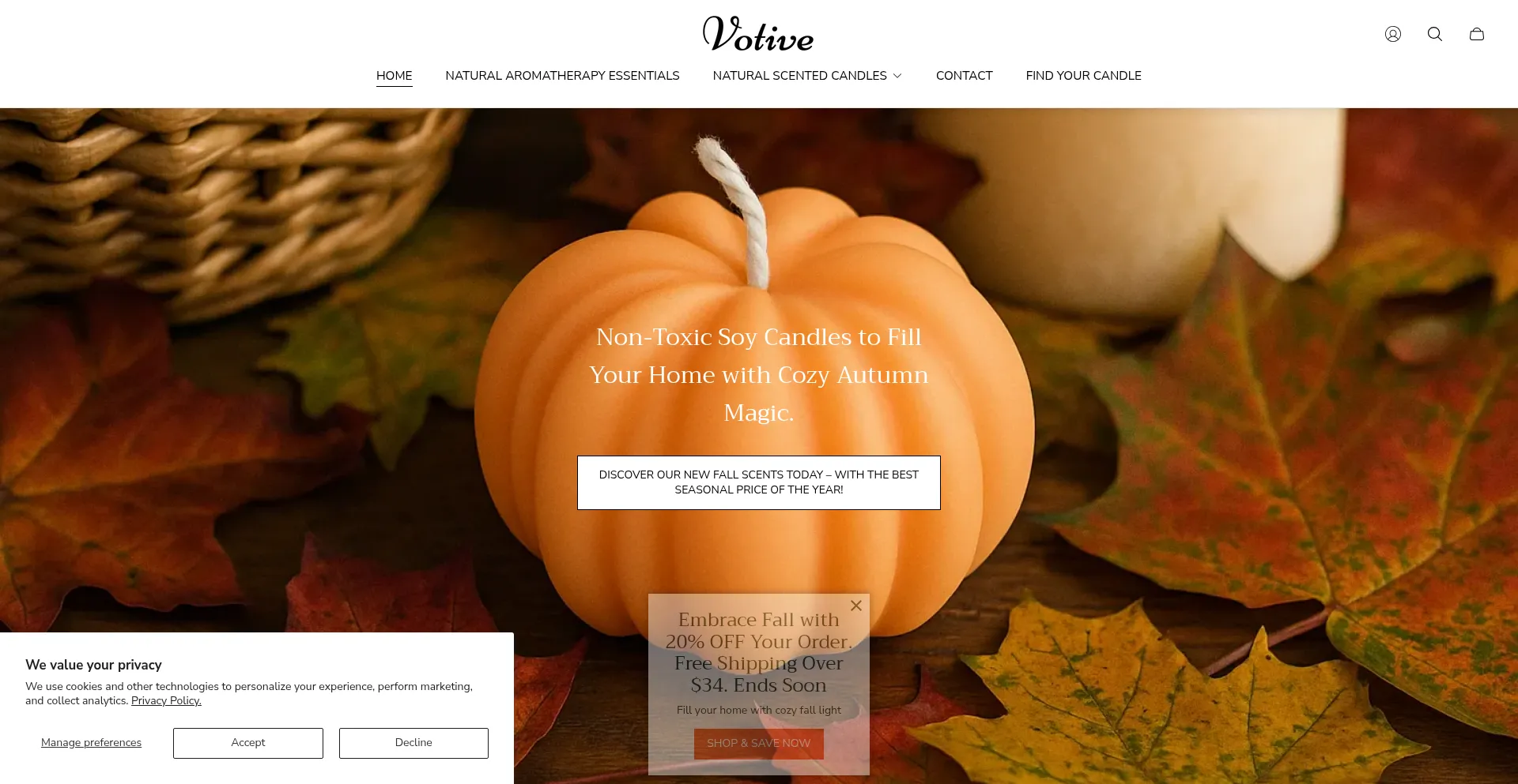 O site implementa mecanismos de consentimento de cookies em conformidade com regulamentações de privacidade como GDPR ou CCPA. Isso demonstra que votivecandlestore.com adere a padrões de proteção de dados e fornece aos usuários controle sobre práticas de coleta de dados pessoais.