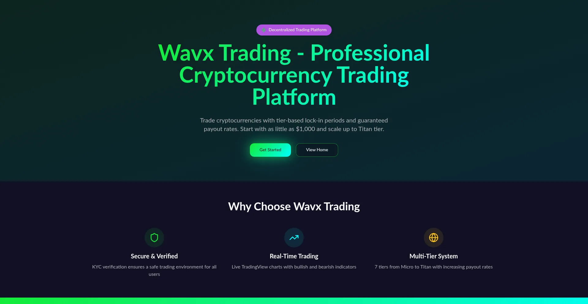 Trade cryptocurrencies on Wavx with tier-based lock-in periods and guaranteed payout rates. Secure KYC-verified platform with real-time trading charts. Start from $1,000.