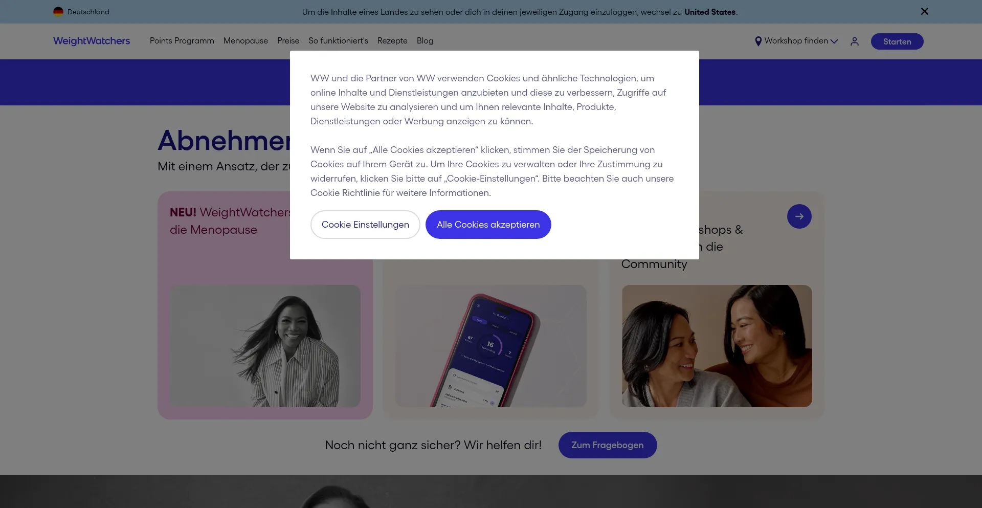 O site implementa mecanismos de consentimento de cookies em conformidade com regulamentações de privacidade como GDPR ou CCPA. Isso demonstra que weightwatchers.de adere a padrões de proteção de dados e fornece aos usuários controle sobre práticas de coleta de dados pessoais.