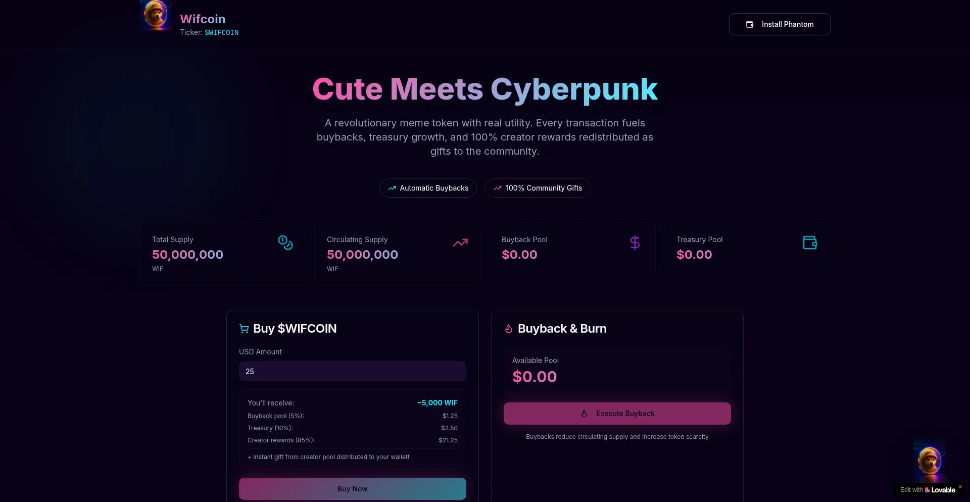 Wifcoin ($WIFCOIN) - Revolutionary meme token with automatic buybacks, treasury funding, and 100% creator rewards redistributed to the community. Join the cyberpunk revolution!