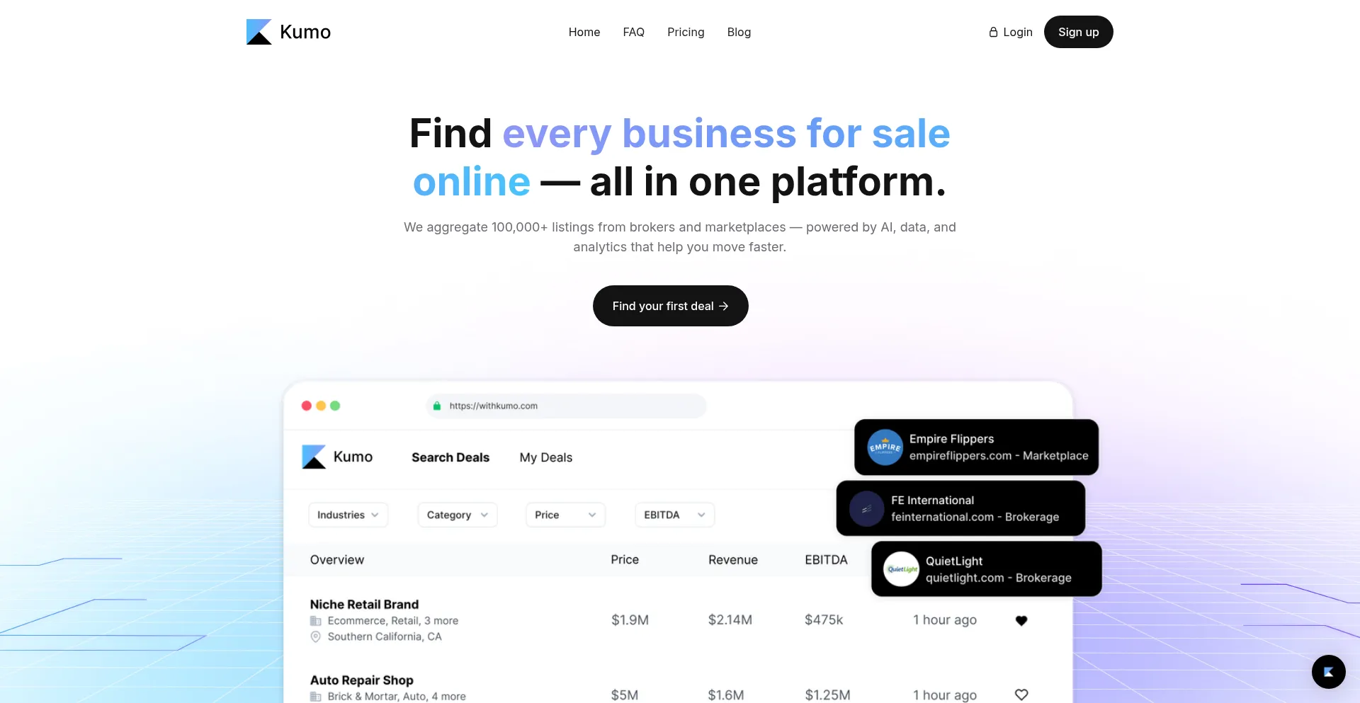 Kumo aggregates hundreds of thousands of business listings from marketplaces, brokerages, and proprietary sources into one easy-to-use platform. Spend less time sourcing, and mo...