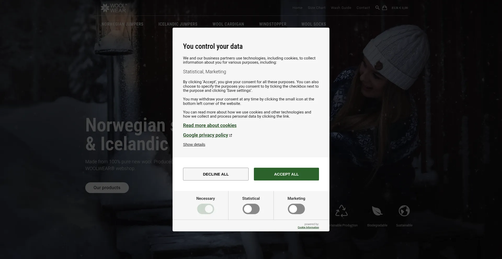 O site implementa mecanismos de consentimento de cookies em conformidade com regulamentações de privacidade como GDPR ou CCPA. Isso demonstra que wool-wear.com adere a padrões de proteção de dados e fornece aos usuários controle sobre práticas de coleta de dados pessoais.
