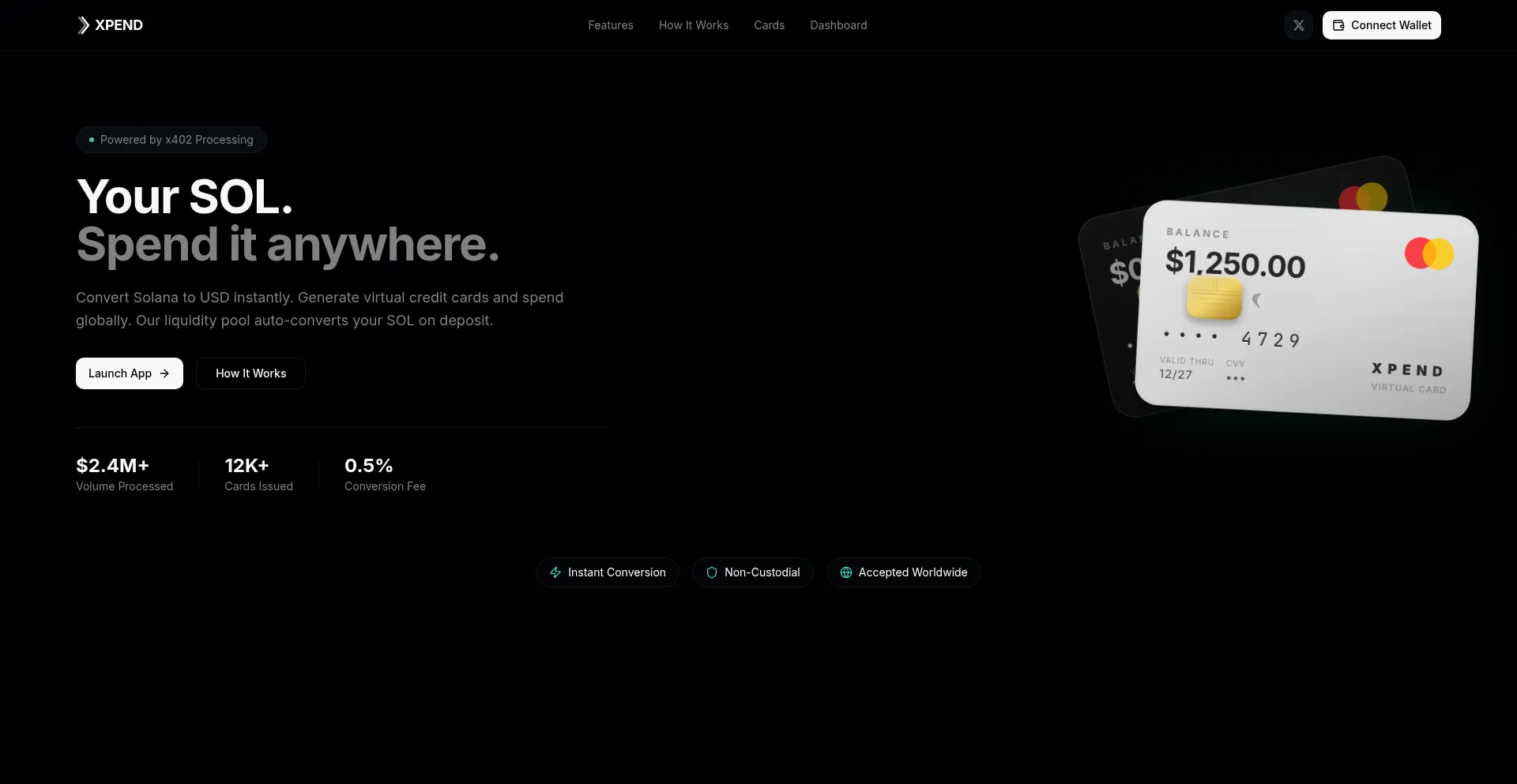Convert SOL to USD instantly. Generate virtual credit cards powered by x402 processing. Spend anywhere, anytime.