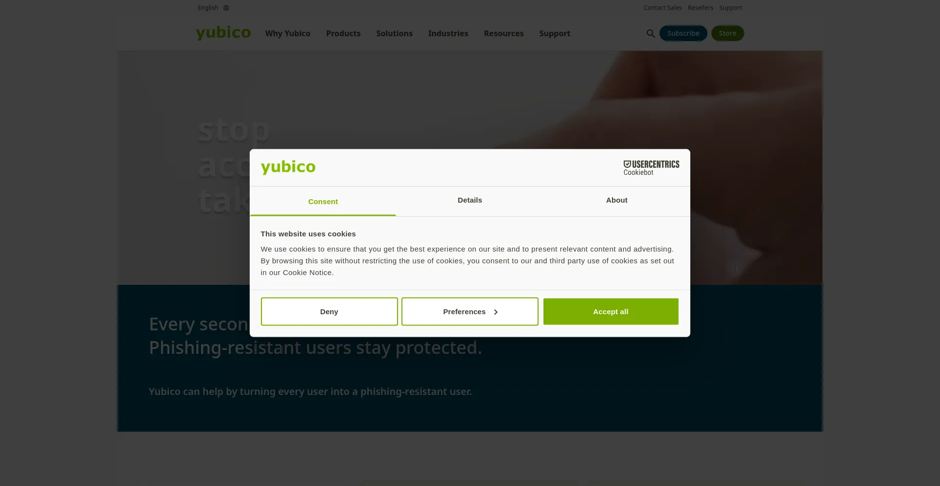 O site implementa mecanismos de consentimento de cookies em conformidade com regulamentações de privacidade como GDPR ou CCPA. Isso demonstra que yubico.com adere a padrões de proteção de dados e fornece aos usuários controle sobre práticas de coleta de dados pessoais.