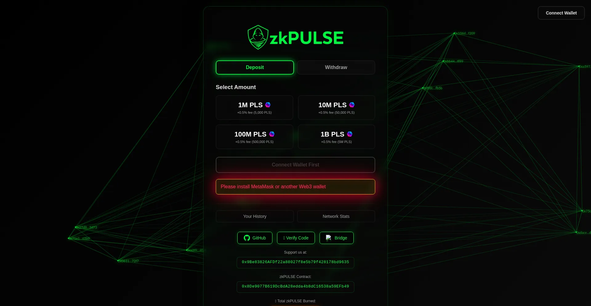 ZK Pulse is the premier privacy protocol on PulseChain. Send and receive PLS and tokens with complete anonymity using zero-knowledge proofs. Non-custodial, decentralized, and fu...